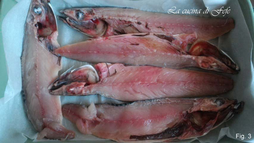 Reinige die Makrelen, indem du sie ausweidest. Schneide den Rücken der Makrele ein und entferne das erste Filet. Drehe sie um und entferne das zweite Filet, indem du die Mittelgräte entfernst. Spüle die Filets unter fließendem Wasser ab (Abb. 1).