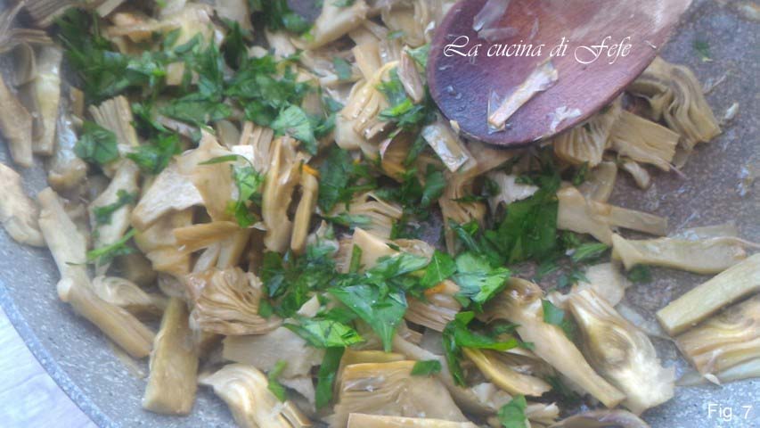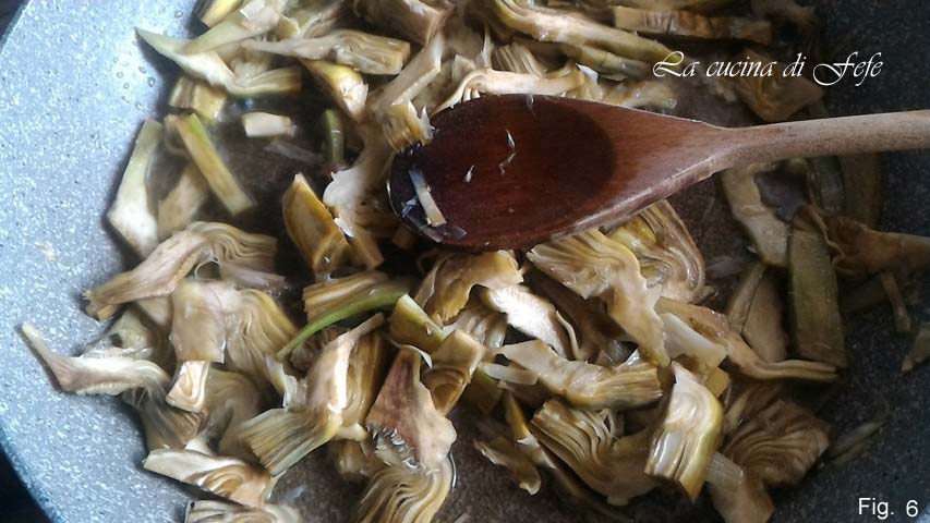 In der Zwischenzeit, putze die Artischocken, entferne den inneren Bart, schneide die Herzen in Scheiben und halte sie in säuerlichem Wasser mit Zitronensaft. In einer antihaftbeschichteten Pfanne den Knoblauch mit zwei vollen Esslöffeln Öl anbraten. Füge die gut abgetropften Artischocken hinzu und lass sie 2 Minuten lang anbraten (Abb. 5).