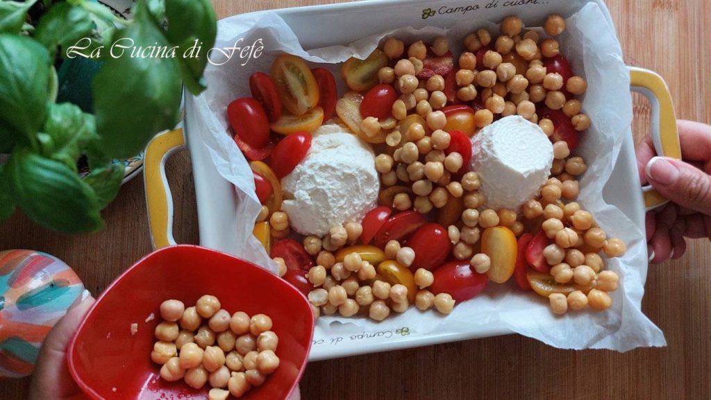 In einer mit Backpapier ausgelegten Auflaufform die zwei Ricottas* in der Mitte anordnen und die Tomaten und Kichererbsen drumherum verteilen.
