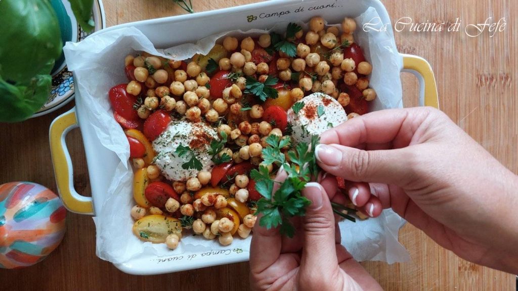Diesen Sommer ging wie so oft in den sozialen Netzwerken das Rezept für im Ofen gebackenen griechischen Feta mit Tomaten viral, ein Gericht, das viele nachgekocht haben, da es sich von einem einfachen vegetarischen Hauptgericht leicht in eine Pastasauce oder einen Dip für Brot verwandeln lässt! Ich war oft versucht, es selbst auszuprobieren, aber die Vorstellung, all diesen salzigen Käse zu backen, obwohl ich ihn oft in meinen Rezepten verwende, hielt mich von meinen guten Vorsätzen ab. Und als ich vor Wochen auf die Variante stieß, die eine Kollegin, der ich seit langem folge, vorgeschlagen hatte, war es Liebe auf den ersten Blick! Sie hat den Feta durch frische Ricottas ersetzt, die viel leichter und bekömmlicher sind, und das Gericht zusätzlich mit vorgekochten Kichererbsen bereichert, die meiner Meinung nach eine wunderbare Ergänzung sind! Ein gesundes und schmackhaftes Gericht im Einklang mit meinem Ernährungsstil, das ich mit viel Enthusiasmus angenommen habe. Mein Beitrag zum Rezept beschränkt sich darauf, noch mehr Geschmack zu verleihen, indem ich Knoblauch in der Schale, Gewürze und aromatische Kräuter hinzufüge, aber die Essenz bleibt gleich! Ein herzliches Dankeschön an Emanuela für diese verlockende, super einfache und schnelle Variante, die ich hoffe, du auch ausprobieren wirst!