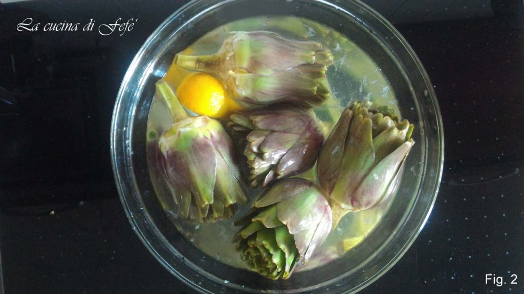 • Lege die Artischocken nach und nach in mit Zitronensaft angesäuertes Wasser, da dieses Gemüse beim Schneiden in Kontakt mit Luft schnell oxidiert und dunkler wird (Abb. 2).