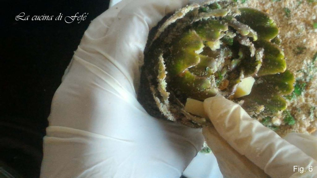 • Füge einige Würfel von Caciocavallo oder sizilianischen Tuma im Herzen der Artischocke und zwischen die äußeren Blütenblätter hinzu (Abb. 2).