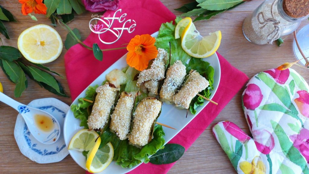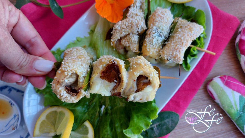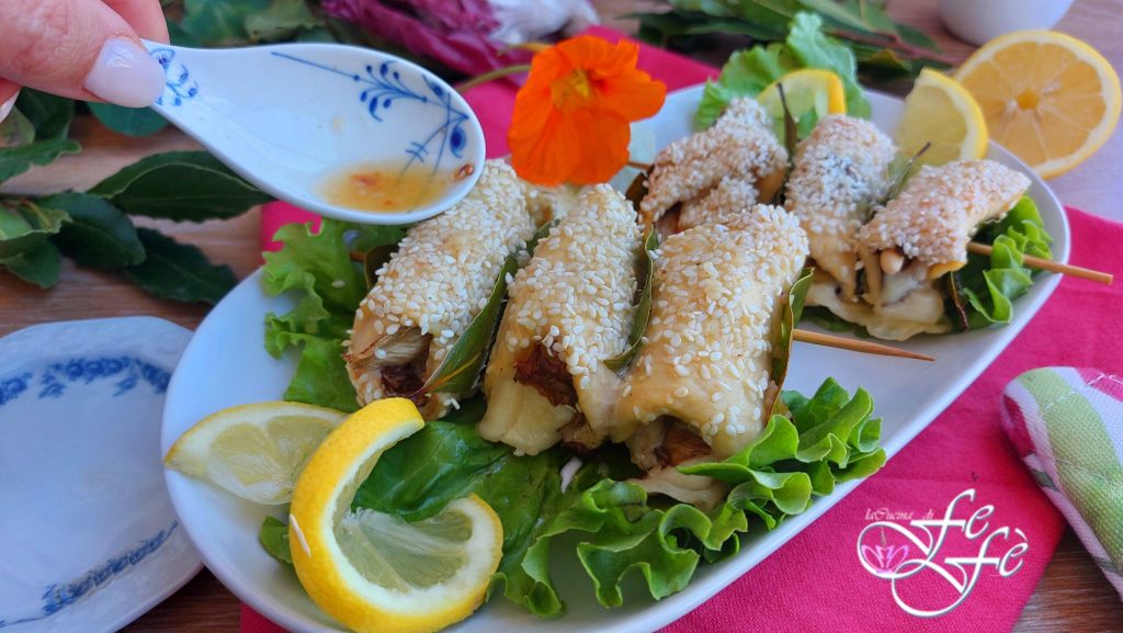 Die Hähnchenspieße mit Radicchio, Lorbeer und Sesam waren eines meiner allerersten Rezepte, als ich noch den alten Blog hatte und sie mit wirklich skandalösen Fotos in den Archiven fand! Seitdem habe ich immer mehr Wert auf die Ästhetik meiner Gerichte und deren Präsentation gelegt. Also, nachdem ich heute Morgen beim meinem vertrauenswürdigen Metzger frisches Freilandhähnchen gekauft habe, war ich überzeugt, dass diese Spieße unbedingt auf den neuen Blog gehören! Sie sind nämlich ein wirklich leckeres und superschnell zuzubereitendes Hauptgericht, da die Füllung roh bleibt, sodass man nicht viel Zeit am Herd verliert. Der Radicchio verleiht dem zarten Fleisch einen leicht bitteren Nachgeschmack, der eine perfekte Geschmacksharmonie schafft, während die Sesampanade dem Gaumen eine besondere geröstete und gleichzeitig knusprige Note verleiht! Ganz zu schweigen von ihren gesundheitlichen Vorteilen, insbesondere der Tatsache, dass Sesam als eine der wichtigsten pflanzlichen Kalziumquellen gilt, die, wie ich schon mehrfach gesagt habe, wirklich nützlich sind, um Knochen und Zähne zu stärken. Nach dem Garen haben sie einen wirklich leckeren aromatischen Saft freigesetzt, den Sie mit einem Löffel aufnehmen und Ihre Spieße vor dem Servieren damit beträufeln können. Probieren Sie sie aus, denn sie werden von allen sehr geschätzt, selbst von denjenigen, die Hähnchen nicht so gerne sehen, und sie werden im wahrsten Sinne des Wortes heiß begehrt sein!