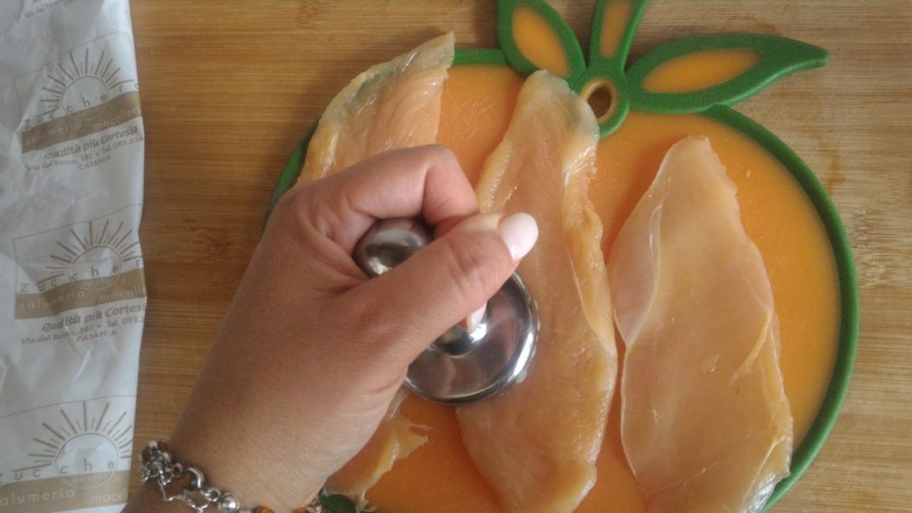 Auf einem Schneidebrett die Hähnchenscheiben klopfen mit einem Fleischklopfer, um sie zu erweitern und flach zu drücken.