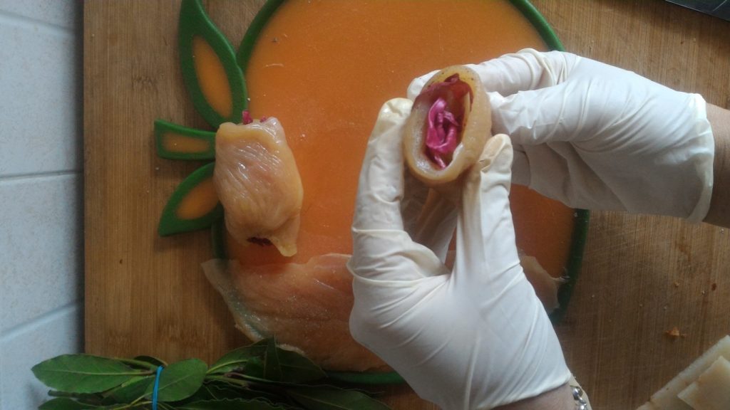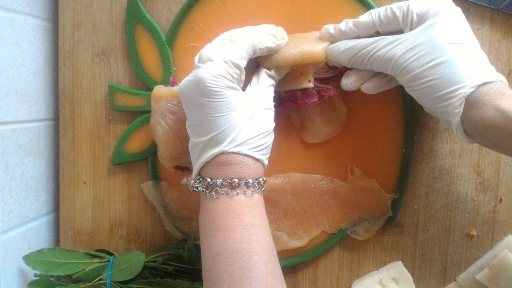 Legen Sie auf jede Hähnchenscheibe einige Streifen Radicchio, zuvor gewaschen und gedrückt, und Provolone-Würfel.