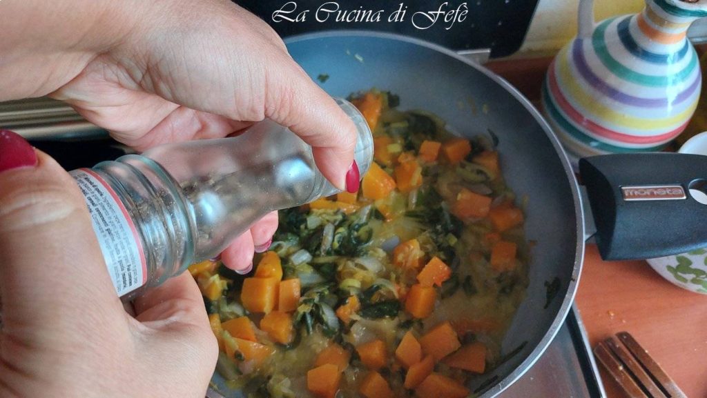 In einer Pfanne schwitze den Porree und den Mangold mit dem Öl für 2′-3′ an.