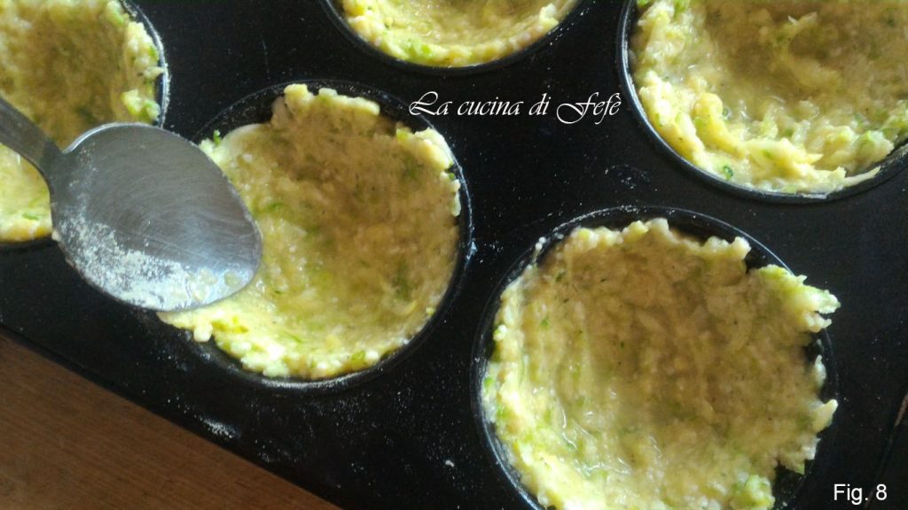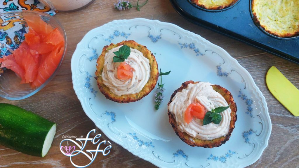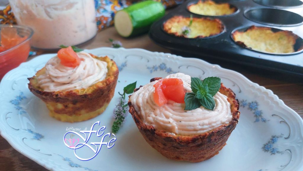 Dieses Rezept entstand aus der Notwendigkeit, Eier und nicht mehr ganz frische Zucchini zu verbrauchen, aber auch aus dem Wunsch, etwas Leckeres und Leichtes zuzubereiten! Wenn Sie wie ich auf der Suche nach einem Gericht sind, das mindestens eine dieser beiden Anforderungen erfüllt, dann dürfen Sie diese Zucchinikörbchen wirklich nicht verpassen! Sie sind recht einfach zuzubereiten, man braucht nur die klassischen Muffinformen und schon ist alles erledigt! Sie sind perfekt als informelle Vorspeise im Freien oder als Fingerfood, das bei einem Buffet-Aperitif serviert wird! Sie schmecken sowohl lauwarm als auch kalt, sodass sie vom Frühling bis in den Sommer hinein ideal sind! Zudem sind sie auch glutenfrei, da sie mit feinem Maismehl zubereitet werden, nicht das grobe, um es klarzustellen! So erfreuen Sie mit wenigen und einfachen Schritten auch diejenigen, die glutenintolerant sind! Das kann doch nicht schaden, oder? Diese Körbchen enthalten eine weiche und samtige Lachs-Mousse mit Kräutern, die der Kombination einen frischen und köstlichen Touch verleiht, der Ihre Gäste überraschen wird! Die Mengenangaben reichen nur für etwa fünf Körbchen, daher empfehle ich für ein Buffet, die Mengen zu verdoppeln oder sogar zu verdreifachen, je nach Ihren Bedürfnissen! Sie können auch die Füllung variieren, indem Sie den Lachs durch Mortadella und gehackte Pistazien ersetzen. Ein Genuss Bissen für Bissen!