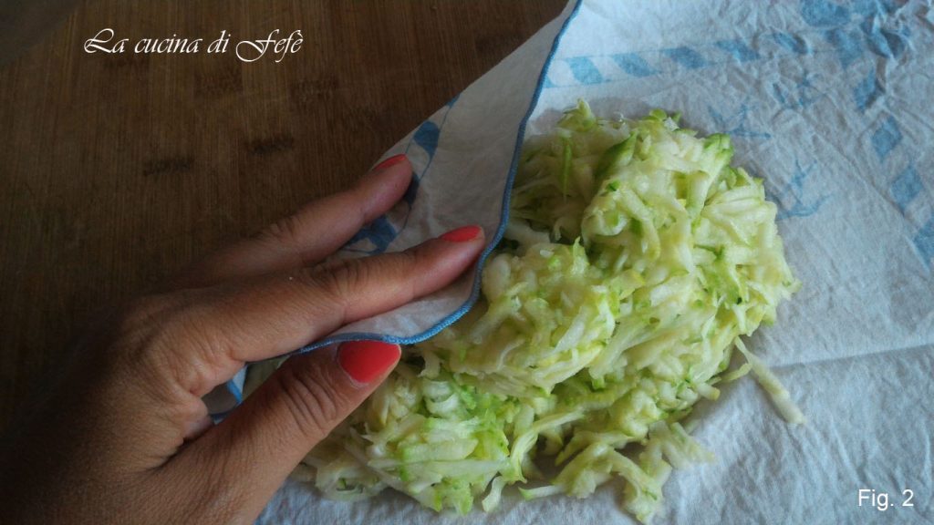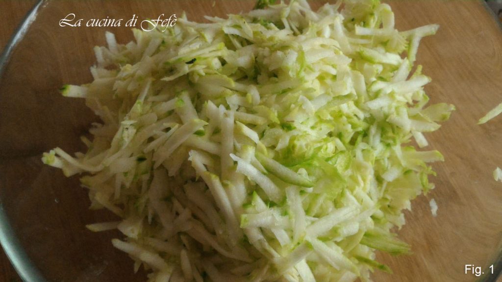 Beginnen Sie, indem Sie die Zucchini waschen und schneiden, ich habe sie auch geschält, aber das ist optional. Dann reiben Sie sie, fügen eine Prise Salz hinzu und lassen sie 30 Minuten ruhen.