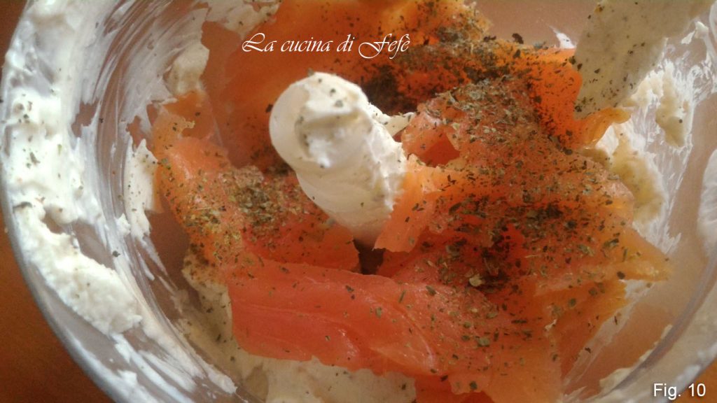 Füllen Sie sie in einen Spritzbeutel mit Sterntülle. Sobald die Körbchen abgekühlt sind, lösen Sie sie vorsichtig mit einem leicht feuchten Messer aus der Form, lassen Sie sie abkühlen und füllen Sie sie mit der Lachs-Mousse und Kräutern.
