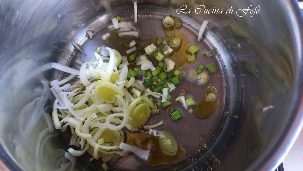In einer großen Kasserolle mit dickem Boden 4 Esslöffel Öl mit der frischen Frühlingszwiebel und einem halben Lauch, in dünne Ringe geschnitten, für ein paar Minuten anbraten.