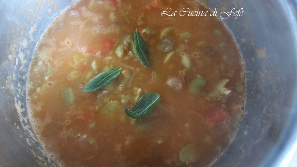 Wenn die Favabohnen anfangen weich zu werden, füge noch etwas heißes Wasser hinzu, nicht viel, die Pasta mit Favabohnen muss cremig bleiben, wenn nötig, füge mehr nach und nach hinzu, dann bringe es wieder zum Kochen und passe das Salz an.
