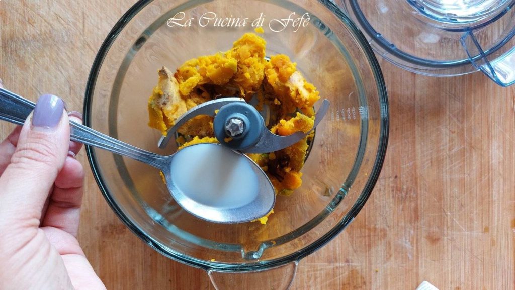 Sobald der Kürbis gekocht ist, aus dem Ofen nehmen, abkühlen lassen und die Schale entfernen, die sich sehr leicht lösen lässt. Sie sollten etwa 150 g Fruchtfleisch netto nach Entfernen der Abfälle erhalten.