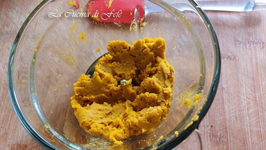 Vervollständigen Sie mit dem gewürzten Kürbispüree und mischen Sie sehr gut, damit alle Zutaten vollständig vermengt werden.