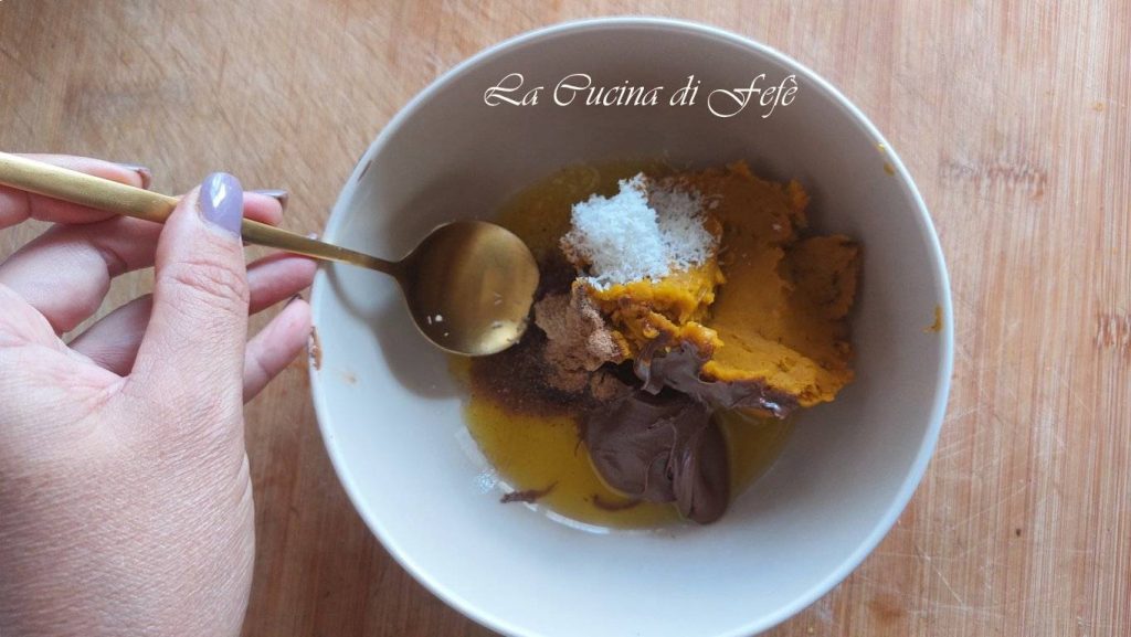 In einer Schüssel kombinieren Sie dann das Kürbispüree mit dem Leinöl, dem Agavensirup, der Mandelbutter oder Haselnussbutter, dem geriebenen Kokos und dem Gewürzmix (Zimt, Kardamom und Muskatnuss).