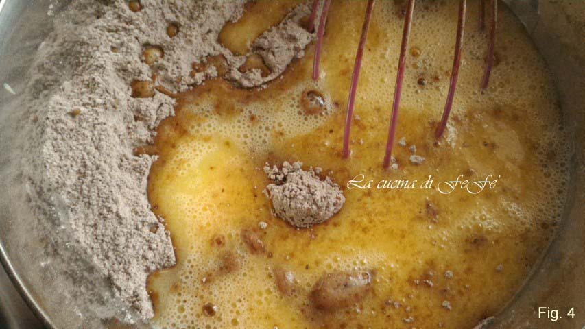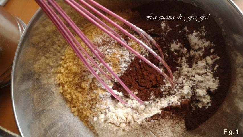 Am nächsten Tag die trockenen Zutaten in eine große Schüssel geben, also Reismehl, Kakao, Maisstärke und das gesiebte Backpulver, dann Zucker und Salz.