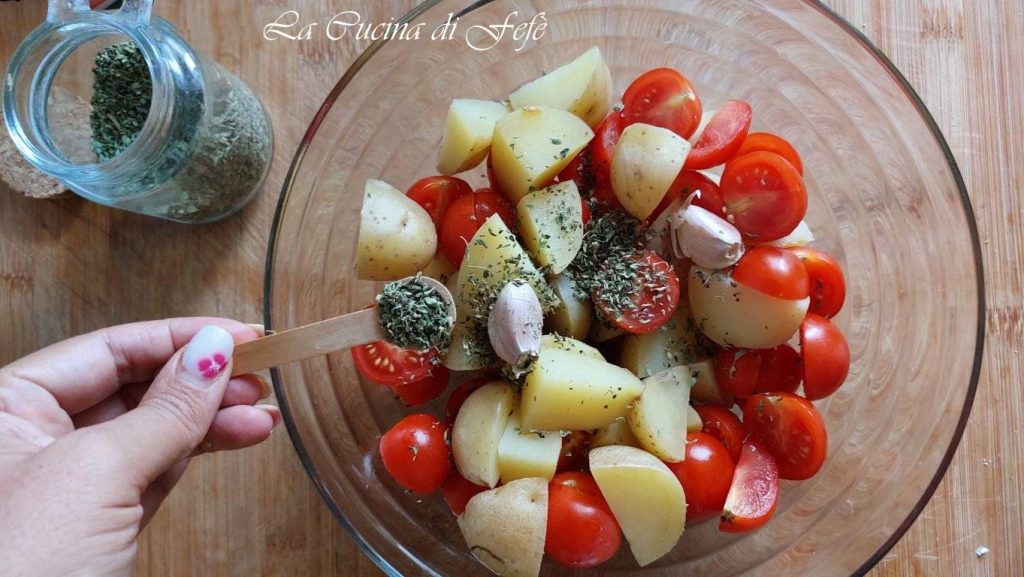 Sobald sie kalt sind, geben Sie die Kartoffeln in eine große Schüssel, fügen Sie die halbierten Kirschtomaten hinzu, die zuvor gewaschen und halbiert wurden, 2 Knoblauchzehen in der Schale und den Oregano.