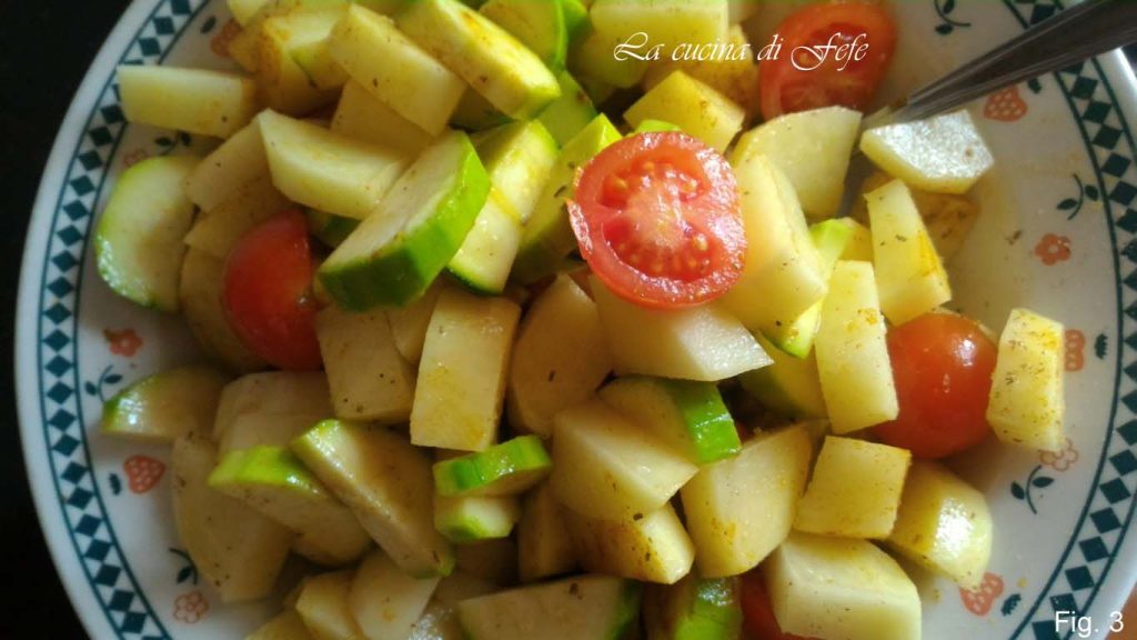 Lasse sie 30′ einziehen und ruhen. In der Zwischenzeit wasche und schäle das Gemüse. Schneide die Kartoffeln und Zucchini in Stücke und die Tomaten in Hälften. Würze mit 2 gehäuften Esslöffeln Öl, dem Rest der Kurkuma, einer Prise Salz und einer Prise Pfeffer (Abb. 3).