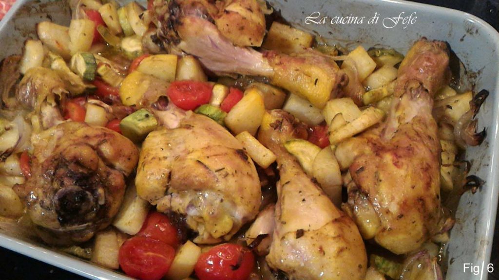 Backe bei 200°C für etwa 40′-45′, drehe sie in der Hälfte der Garzeit um. Wenn das Huhn goldbraun ist, ausschalten, aus dem Ofen nehmen und abkühlen lassen (Abb. 6).