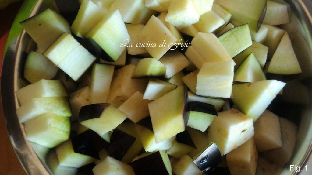 • Schneiden Sie die Aubergine auf einem Schneidebrett ab und entfernen Sie den Stiel. Schneiden Sie sie dann in Würfel (Abb. 1).
