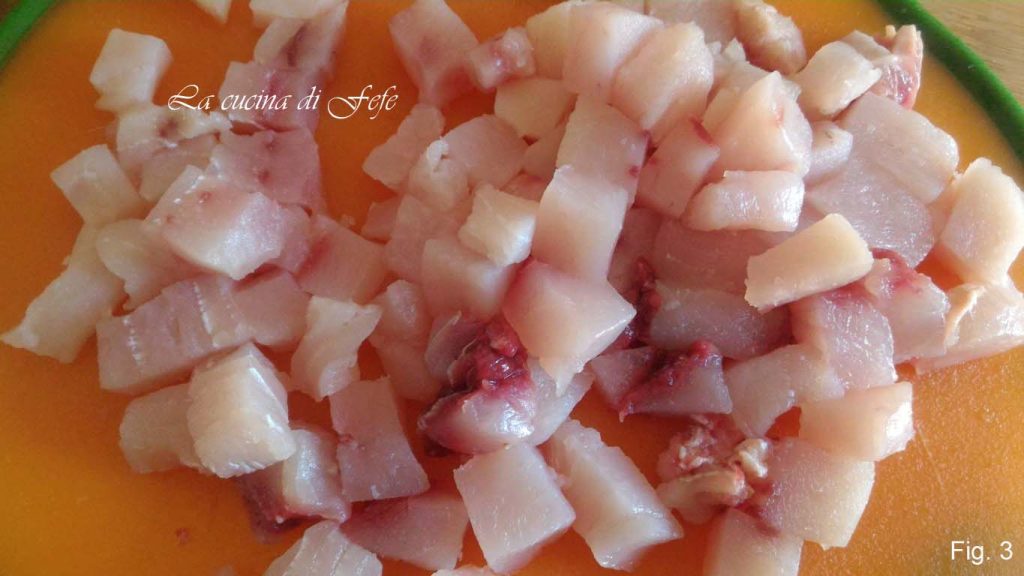 • Entfernen Sie die Haut des Schwertfisches und schneiden Sie ihn in Würfel (Abb. 3).