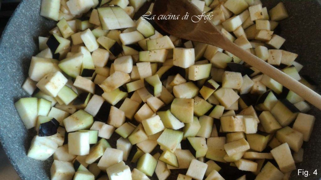 • Lassen Sie in einem Wok den Knoblauch mit zwei Umdrehungen Öl goldbraun werden. Nach 1 Minute die Auberginenwürfel hinzufügen und noch 1 Minute bei starker Hitze anschwitzen (Abb. 4).