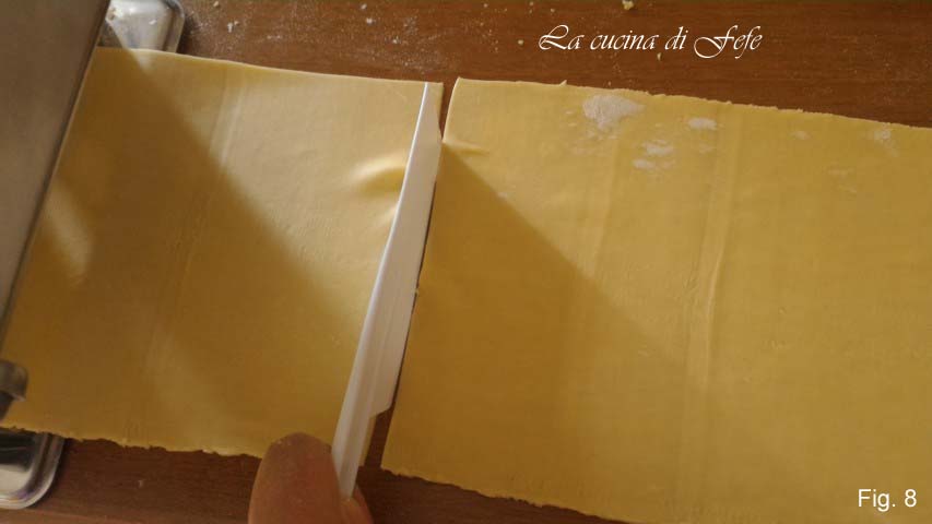 Die Walzen enger stellen und den Teig weiter durchgeben, bis die gewünschte Teigstärke erreicht ist. Es wird empfohlen, den Teig immer in kürzere Blätter zu teilen, um diese Vorgänge zu erleichtern (Abb. 8).