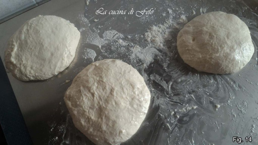 🟣**** Bei Bedarf kann der Teig in zwei Teile geteilt werden, um zwei größere Pinsas zu erhalten. Ich habe drei kleinere bevorzugt, um sie auf drei verschiedene Arten zu belegen.