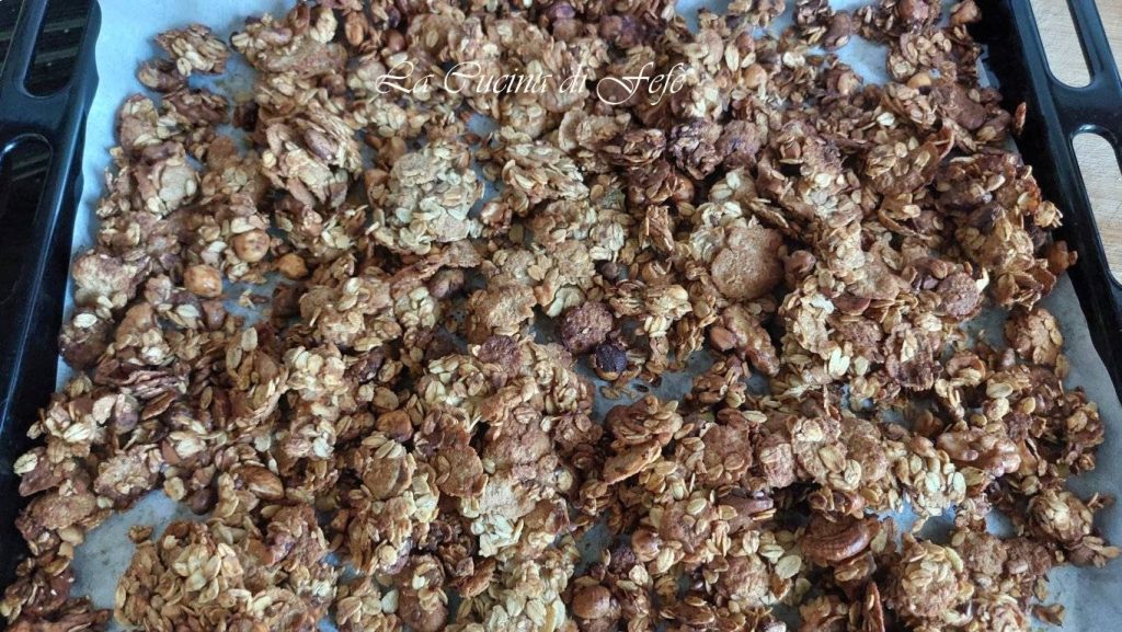 Nach dieser Zeit vorsichtig mit einem Spatel mischen, um es zu wenden, ohne es zu sehr zu zerbröseln, wieder in den Ofen geben, die Temperatur auf 160°C reduzieren und weitere 10 Minuten backen. Natürlich können sich die Zeiten je nach Ofen etwas ändern, daher empfehle ich, regelmäßig zu kontrollieren, um ein Anbrennen zu vermeiden.