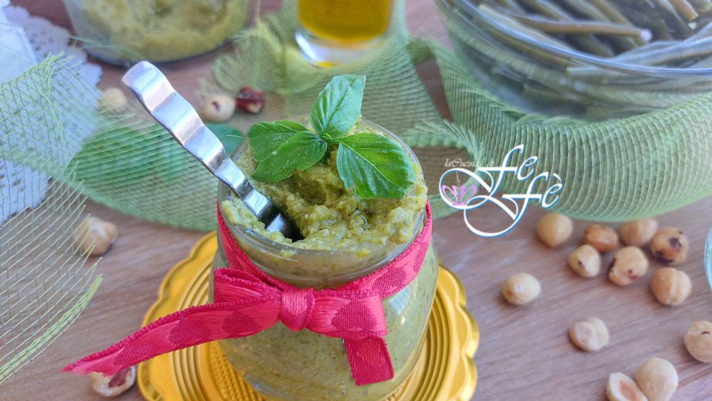 Um die im Ofen gebackenen Trofie mit grünen Bohnen und Pistazienpesto zuzubereiten, beginnen Sie mit dem grünen Bohnenpesto, indem Sie die Schritte dieses Rezepts befolgen (Abb. 1).
