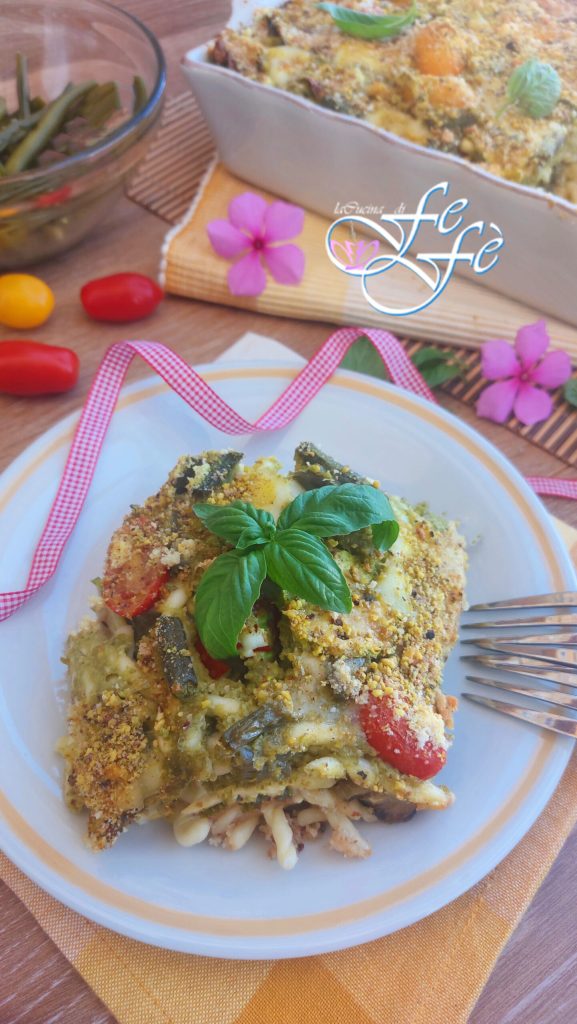Diesen Sommer hatte ich das Glück, einen Obst- und Gemüsehändler zu finden, der eine hervorragende Auswahl an grünen Bohnen an seinem Stand hatte, natürlich lokale. Ich habe mich sofort darauf gestürzt, um die immense Knappheit des letzten Jahres auszugleichen! Ich wollte sie so sehr, dass ich es vorgezogen habe, sie während ihrer gesamten Saison in ihrer Einfachheit zu genießen, also ohne dieses oder jenes neue Rezept zu experimentieren, es schien mir sogar eine Verschwendung! Erst jetzt, da wir die letzten Züge machen, habe ich beschlossen, mit diesen im Ofen gebackenen Trofie, die mit einem Pesto aus grünen Bohnen zubereitet werden, die Hauptdarsteller sind, und deren Rezept ich bereits geteilt habe, einen krönenden Abschluss zu machen Rezept! Die grünen Bohnen sind eine wertvolle Quelle sowohl für Vitamine als auch für Mineralien. Es sei jedoch darauf hingewiesen, dass ihre wohltuenden Eigenschaften hauptsächlich mit den Antioxidantien zusammenhängen, die sehr reichlich vorhanden sind und unserem Körper helfen, sich vor den Auswirkungen der freien Radikale zu schützen, also vor vorzeitiger Alterung und Entzündungen. Damit diese wertvollen Nährstoffe jedoch bei Tisch aufgenommen werden, wird empfohlen, die frischen grünen Bohnen dämpfen zu damit sie nicht im Kochwasser verloren gehen und so weit wie möglich unverändert bleiben. Nachdem dies wie üblich vorausgeschickt wurde, empfehle ich, dieses vegetarische Hauptgericht auszuprobieren, nicht nur weil es wirklich gesund und energiereich ist, sondern auch weil es eine ausgezeichnete Möglichkeit sein wird, Ihre Kinder dazu zu bringen, Gemüse zu essen, das teilweise darin püriert wird, anstelle der klassischen Béchamel! Die Köstlichkeit dieses Gerichts kommt von seiner inneren Schicht, die reich an Gemüse ist, darunter Kirschtomaten, gegrillte Zucchini und die grünen Bohnen selbst, und gewürzt mit Scheiben von kalabrischem DOP-Provola Silana, die schmelzen. Schließlich ein doppeltes Pesto aus grünen Bohnen, reich an gerösteten Haselnüssen und ein paar Löffeln Pistazienpesto! Alles bestäubt mit einer schönen Prise hausgemachtem Paniermehl und Pistazienmehl, als gäbe es kein Morgen! Ein perfektes Gericht für Ihre besonderen Mittagessen, um einfach zu beeindrucken und Ihren Gästen eine wertvolle Alternative zu den üblichen Ofennudeln zu bieten, die einem das Wasser im Mund zusammenlaufen lassen!