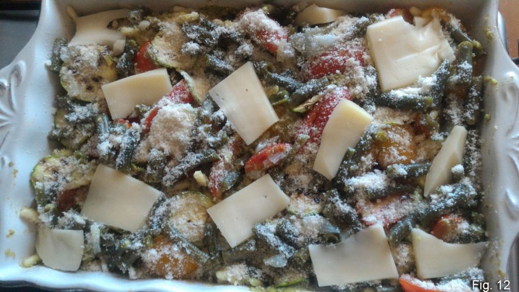 Garnieren Sie mit der Hälfte der in Scheiben geschnittenen Provola und der Hälfte des geriebenen Parmesans (Abb. 12). Wiederholen Sie den Vorgang, indem Sie eine zweite und letzte Schicht mit den restlichen Zutaten erstellen. Bestreuen Sie mit dem restlichen geriebenen Parmesan, ein paar Löffeln Semmelbröseln und schließlich dem Pistazienmehl (Abb. 13).