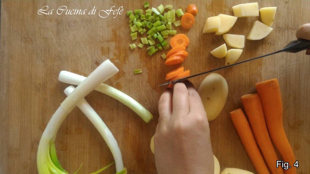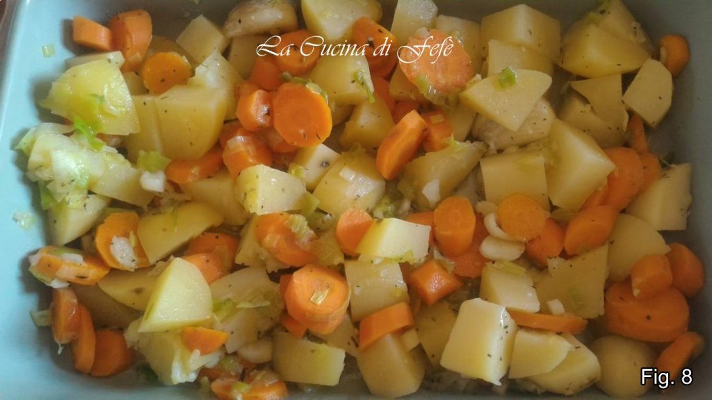 Fügen Sie auch die Kartoffeln und Karotten hinzu, decken Sie den Deckel und lassen Sie sie bei niedriger Hitze etwa 13 Minuten schmoren, wobei Sie das Gemüse nur bei Bedarf mit wenig heißem Wasser benetzen (Abb. 6). Nach dieser Zeit ausschalten, salzen und nach Geschmack pfeffern und abkühlen lassen (Abb. 7).