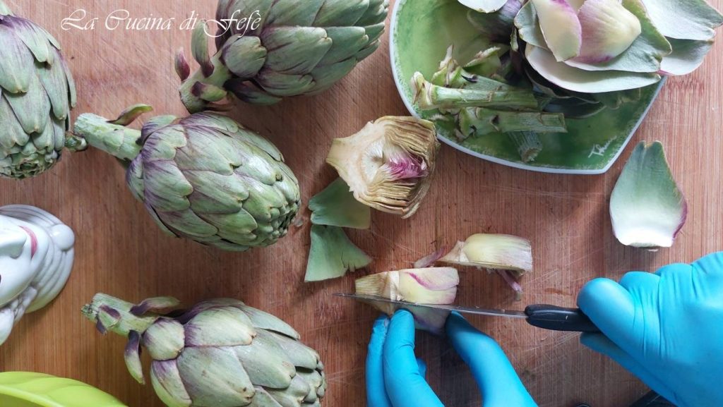 • Um die überbackenen Artischocken zuzubereiten, beginne mit dem Putzen der Artischocken. Ich empfehle, Handschuhe zu tragen, damit deine Hände nicht verfärben, und vorher in einer großen Schüssel sauriges Wasser mit dem Saft einer Zitrone vorzubereiten, damit die Artischocken nicht braun werden. Entferne die äußeren, härteren Blätter, indem du die Artischocken in der Hand drehst.