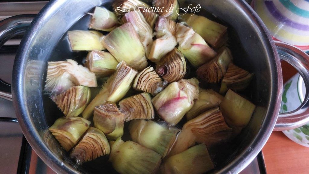 • In einem Topf reichlich Wasser zum Kochen bringen, eine Prise Salz hinzufügen und die Artischocken hineingeben. Sobald das Wasser kocht, kurz 4 Minuten blanchieren.