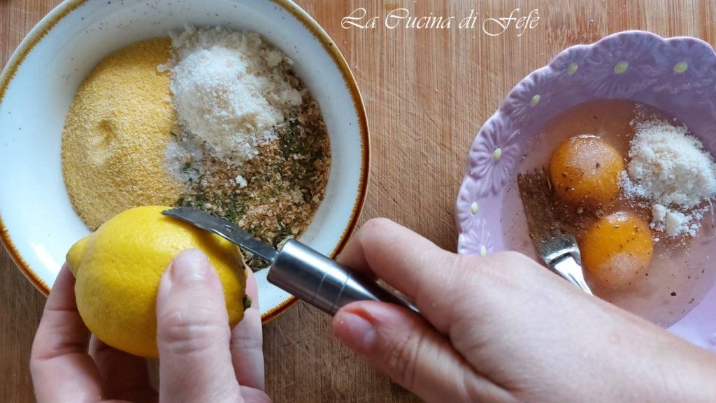 • In einer anderen Schüssel Paniermehl, feines Maismehl (Fioretto) und den geriebenen Pecorino mischen, mit einer Prise Salz abschmecken, Schnittlauch und die abgeriebene Schale einer unbehandelten Zitrone hinzufügen.