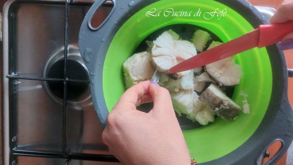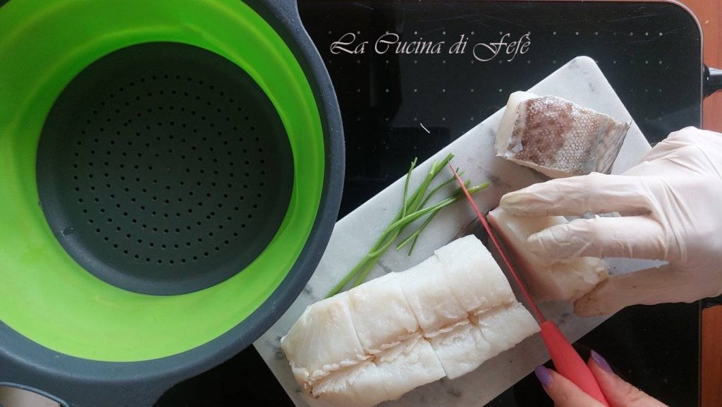• Um dieses Gericht zuzubereiten, beginnt man mit dem Kabeljau, der bereits eingeweicht und entsalzt ist. Spüle ihn ein letztes Mal unter fließendem Wasser ab, trockne ihn dann mit Küchenpapier ab und schneide ihn mit einem geeigneten Fischmesser in Stücke.