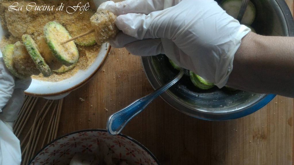 Für eine glutenfreie Version, verwenden Sie halb glutenfreies Paniermehl und Sie haben ein Hauptgericht, das auch für Menschen mit Glutenunverträglichkeit geeignet ist. Um Kreuzkontaminationen zu vermeiden, sollten die glutenfreien Spieße vor den normalen zubereitet und auf einem separaten Blech gebacken werden.