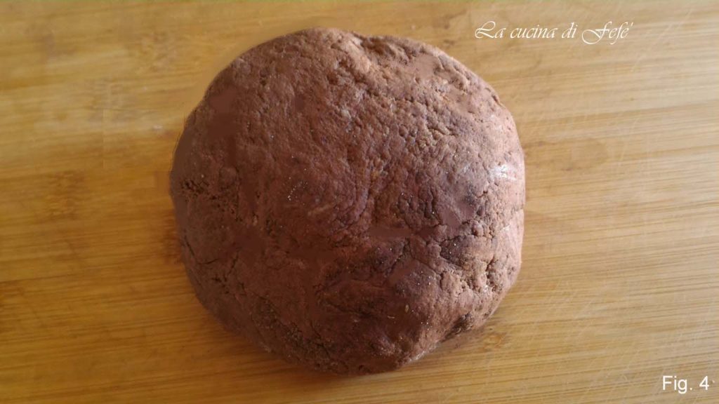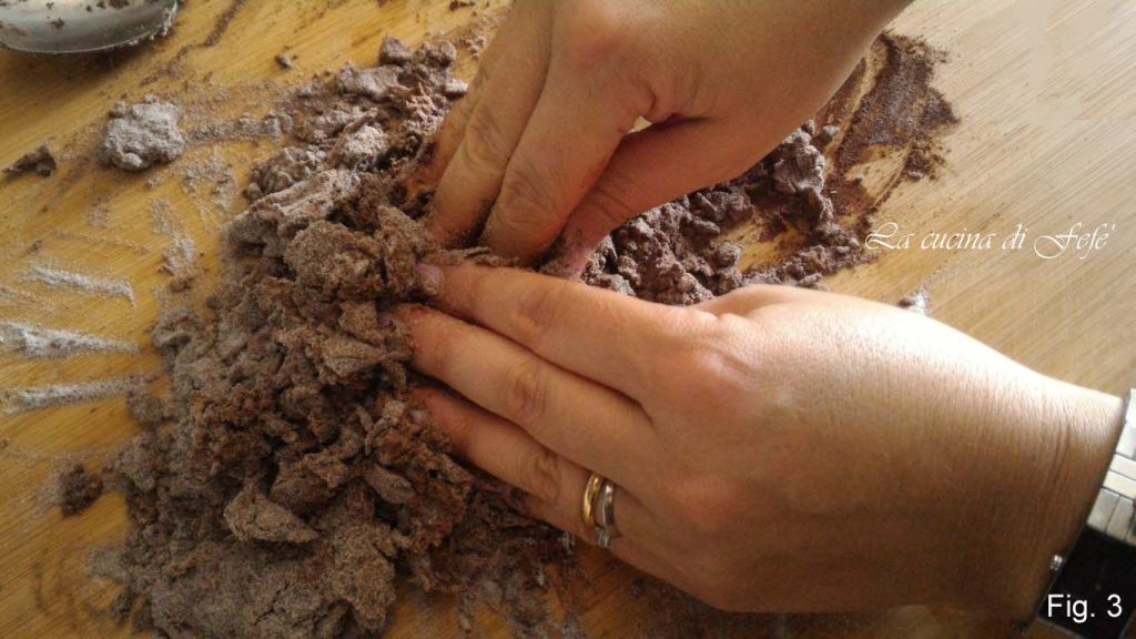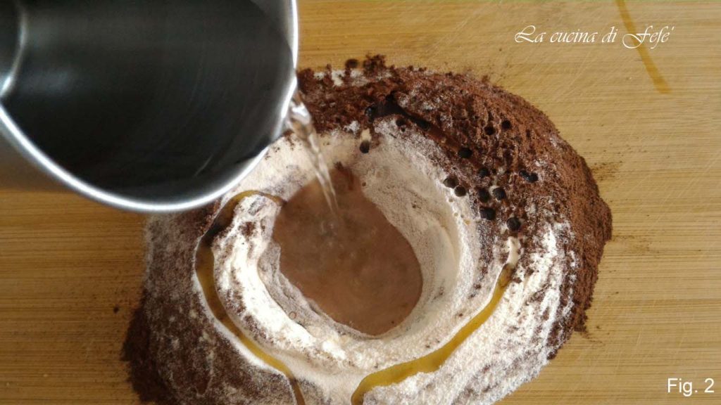 • Auf einer Arbeitsfläche den gesiebten Hartweizengrieß mit dem Kakao vermengen. Eine Prise Salz hinzufügen und eine Mulde formen, dann das Öl nach und nach am Rand hinzufügen.