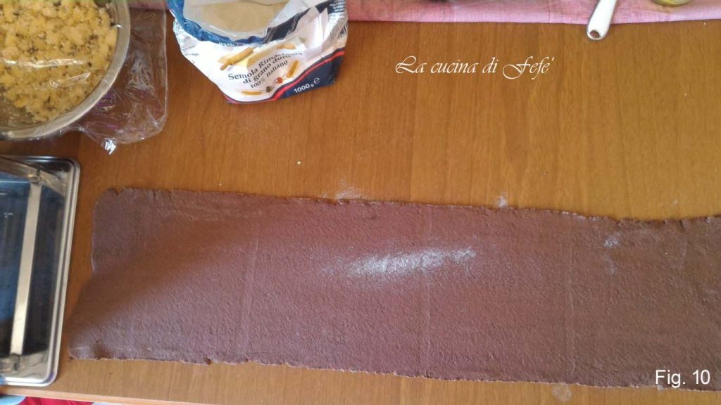 • Den Teig wieder aufnehmen und in zwei Teile teilen. Mit dem ersten Teil fortfahren und den Rest weiterhin mit Frischhaltefolie ruhen lassen. Mit den Händen flachdrücken, leicht mehlen und den Teig mit der Nudelmaschine vom größeren Dicke aus dünn rollen und ihn dann wie einen Fächer falten.