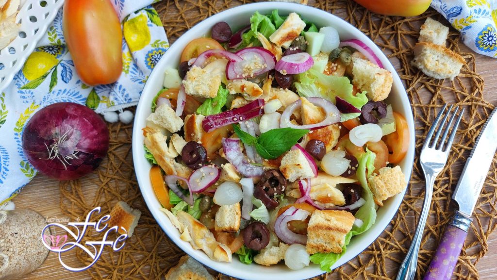 Wie lecker sind doch die Sommer-Salate? Frisch, sättigend, reichhaltig und köstlich! Super bunte und oft vitaminreiche Hauptgerichte, perfekt für heiße Tage oder um sie am Strand unter dem Sonnenschirm zu genießen! Ihre Besonderheit liegt in der Vielseitigkeit und Praktikabilität, denn sie sind einfach und schnell zuzubereiten und können jedes Mal mit allem variiert werden, was Sie sich wünschen! Da wir vor kurzem die neue Rubrik Speciale Insalate Fredde eröffnet haben, lade ich Sie ein, einige Rezepte nachzukochen, insbesondere diesen erfrischenden, super nahrhaften und köstlichen Hähnchensalat! Eine wirklich einzigartige Geschmackskombination! Die Basis bilden knackige Salatherzen, dazu gegrillte Hähnchenstreifen mit Rosmarin, frische Gurken mit einem gewissen Vitamin- und Mineraliengehalt, längliche Tomaten, Ringe von roten Zwiebeln, schwarze Oliven, in Salz eingelegte Kapern und ein Hauch von Süß-Sauer mit den eingelegten Zwiebeln. Alles wird mit Öl, Salz, Limettensaft und einer Prise Sesamkörner gewürzt! Servieren Sie diesen Salat mit leicht gerösteten Baguette-Crostini, und Sie erhalten ein vollständiges Hauptgericht aus ernährungsphysiologischer Sicht! Wenn Sie möchten, können Sie für noch mehr Vollständigkeit auch Hülsenfrüchte wie Kichererbsen oder Cannellini-Bohnen hinzufügen. Perfekt für Ihre Sommer-Brunchs im Freien, auf dem Land, am Meer und sogar im Büro.