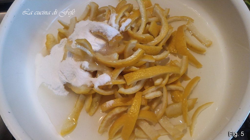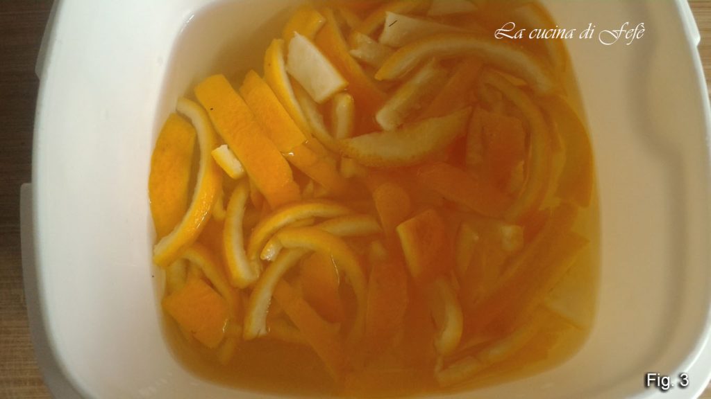🟣 * Das Einweichen: Normalerweise ist es nicht notwendig, das Wasser während der 4-5 Tage des Einweichens zu wechseln, aber wenn die Umgebung wärmer oder feuchter sein sollte, könnte sich Schimmel bilden. In diesem Fall das Wasser wechseln. Dieser Schritt im Wasser entfernt die Bitterkeit der Orangenschalen und vermeidet den ganzen Aufwand, die Schalen 2-3 Mal zu kochen und Töpfe zu verschmutzen, was eine erhebliche Gaseinsparung bedeutet.