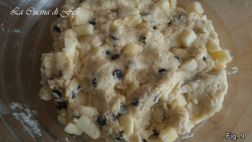 Zuletzt fügt die Schokoladentropfen und die Apfelwürfel mit dem gesamten Zitronensaft hinzu.