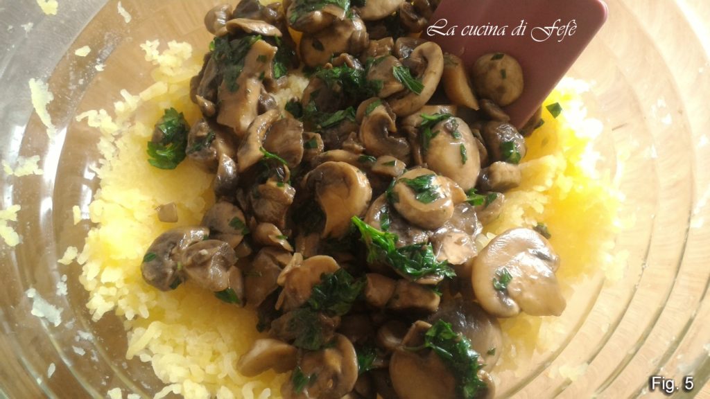 • Wenn die Champignons abgekühlt sind, geben Sie sie zu der Kartoffelpüree (Abb. 5). Fügen Sie jetzt das Ei, eine Prise Salz und Pfeffer nach Belieben hinzu (Abb. 6).