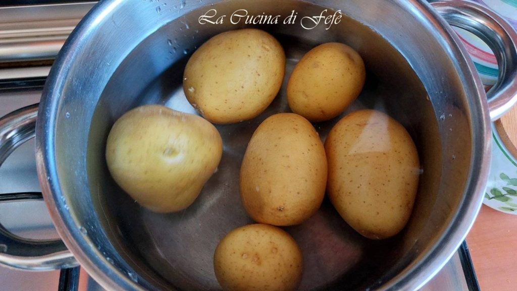 Einmal die Kartoffeln gekocht, noch heiß zerdrücken, bis sie mit einem Kartoffelstampfer püriert sind.