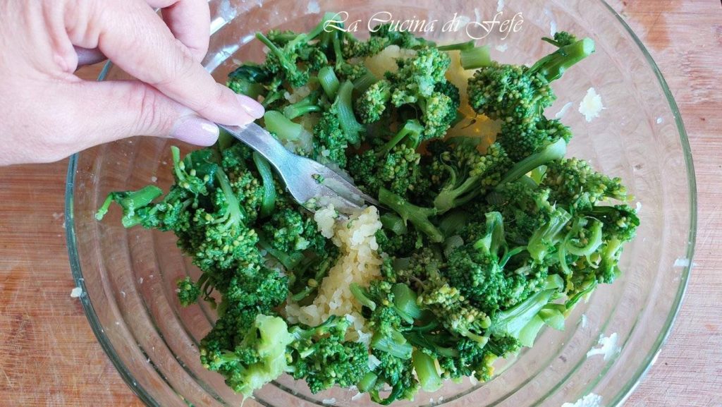 Füge die gut ausgedrückten Brokkoli hinzu und zerdrücke weiter, bis eine homogene und glatte Mischung entsteht.