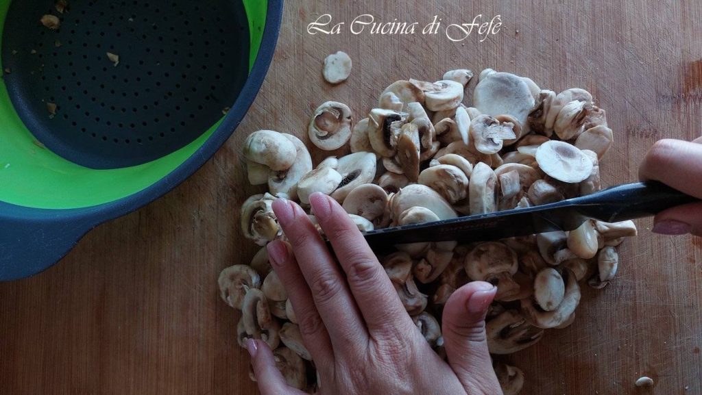 Reinige die Pilze mit einem feuchten Tuch und entferne den unteren Teil des Stiels, wo sich noch Erde befindet, dann schneide sie vom Hut aus mit sauberen und dünnen Schnitten.