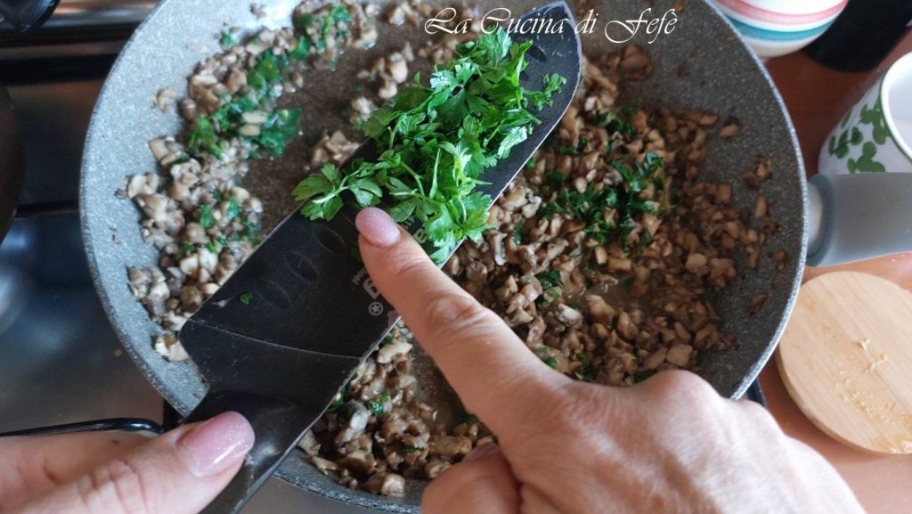 Das Herz des Gerichts ist die Füllung: eine weiche Ricotta-Creme und Pilze, in der Pfanne mit Öl, Knoblauch und Petersilie sautiert.