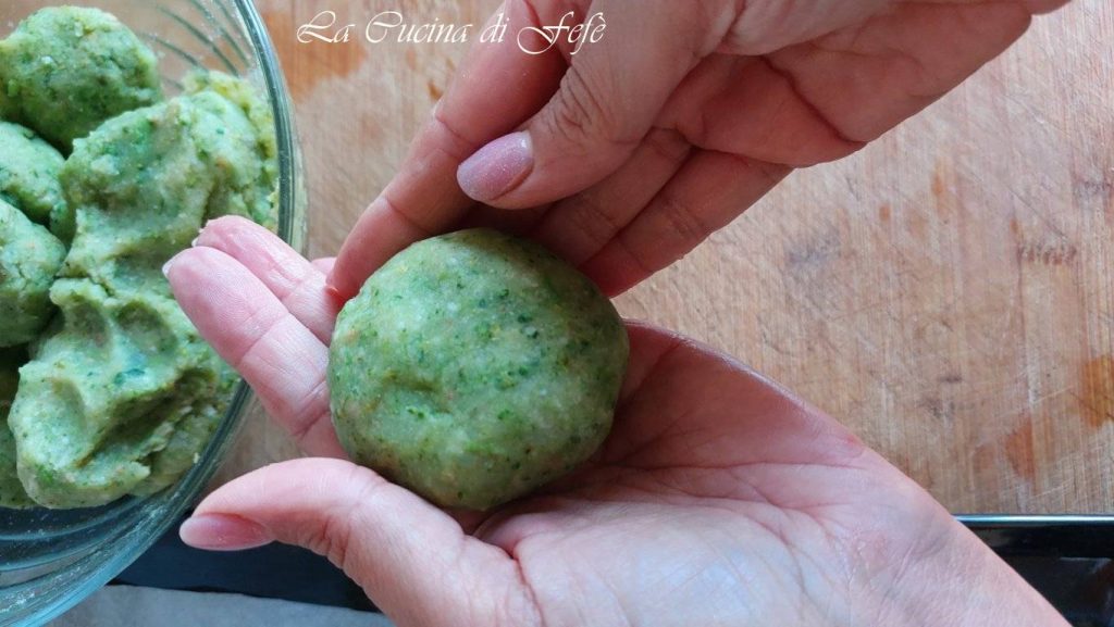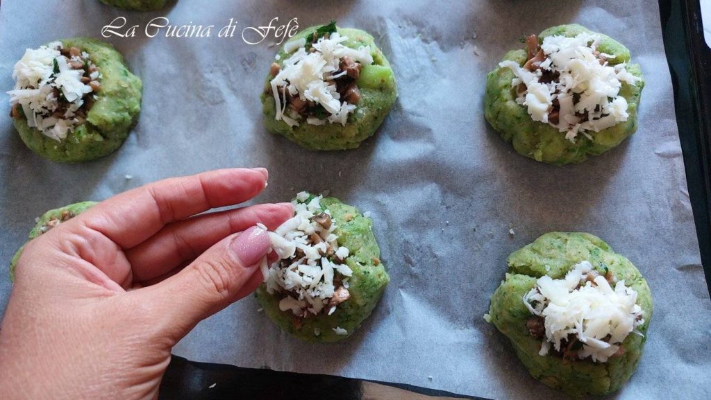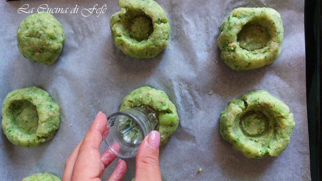 Die Zubereitung ist wirklich intuitiv. Nachdem du die Kartoffeln und Brokkoli gekocht hast, zerdrücke sie und würze sie. Forme kleine Kugeln und mache eine Vertiefung in der Mitte, um sie in kleine „Körbchen“ zu verwandeln.
