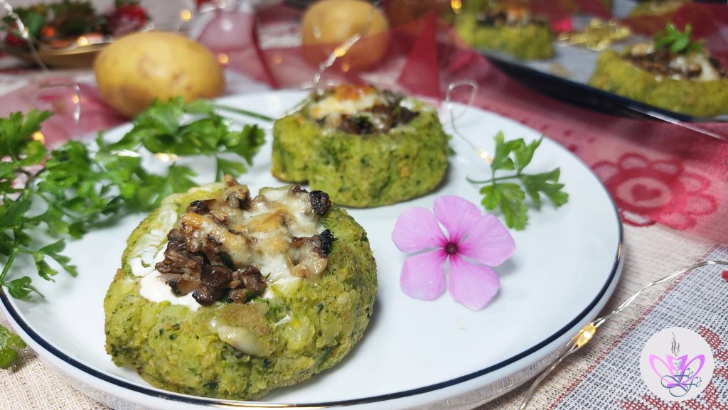 Wir beginnen mit einer fesselnden Idee für dein Weihnachtsmenü. Diese Kartoffel- und Brokkoli-Nester gefüllt mit Ricotta und Pilzen sind die perfekte vegetarische Vorspeise: einfach, schnell zuzubereiten und köstlich.