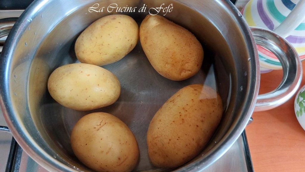 Waschen Sie die Kartoffeln sehr gründlich unter fließendem Wasser, legen Sie sie dann in einen Kochtopf und kochen Sie sie in Salzwasser für ca. 20′ ab dem Kochen. Die Zinken einer Gabel sollten jedenfalls leicht eindringen.